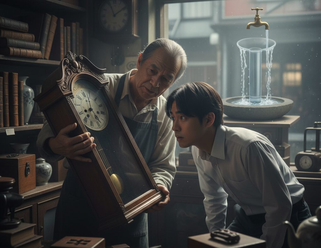 店主は部屋の隅にある古びた置き時計を見つめている。